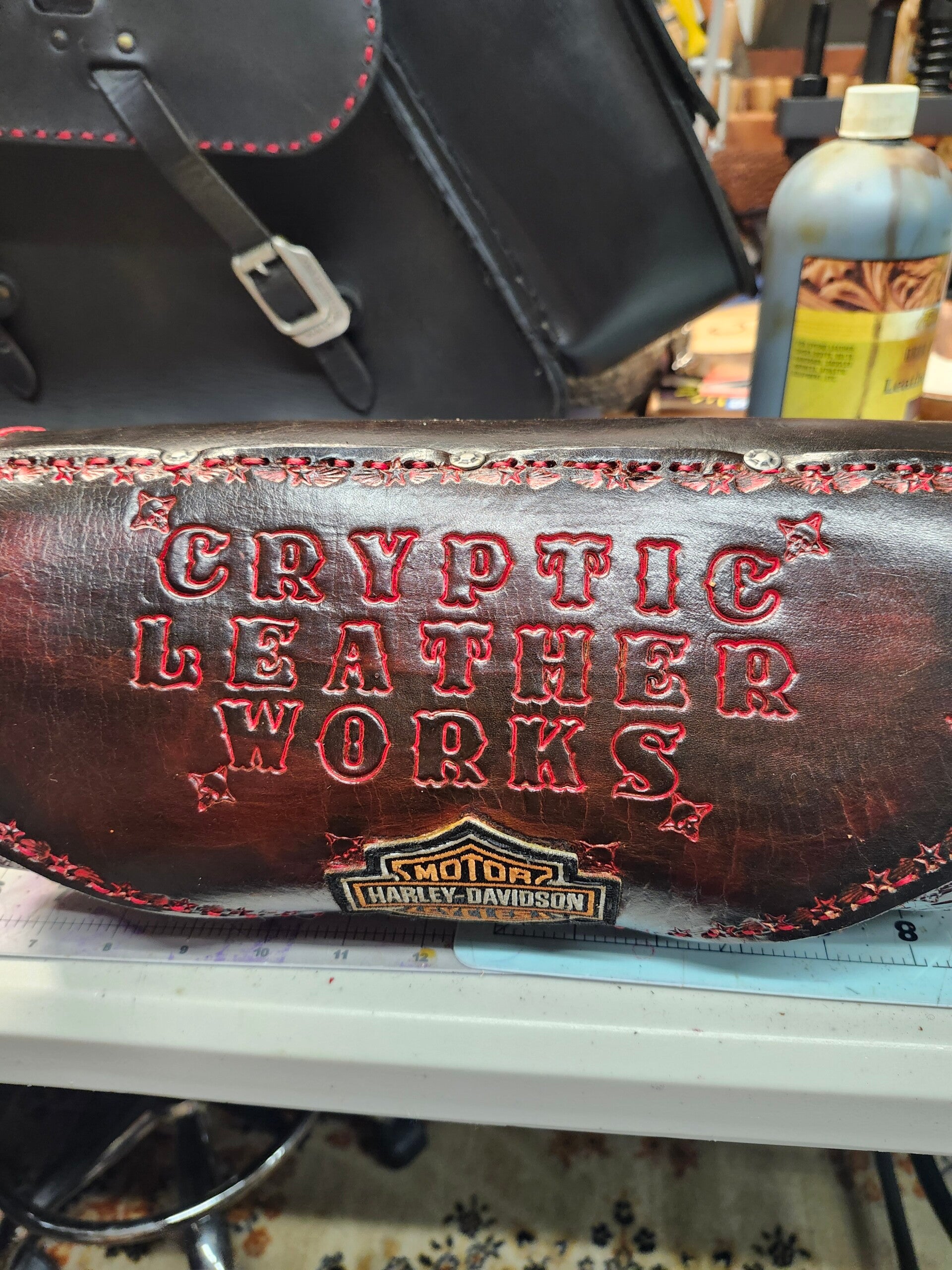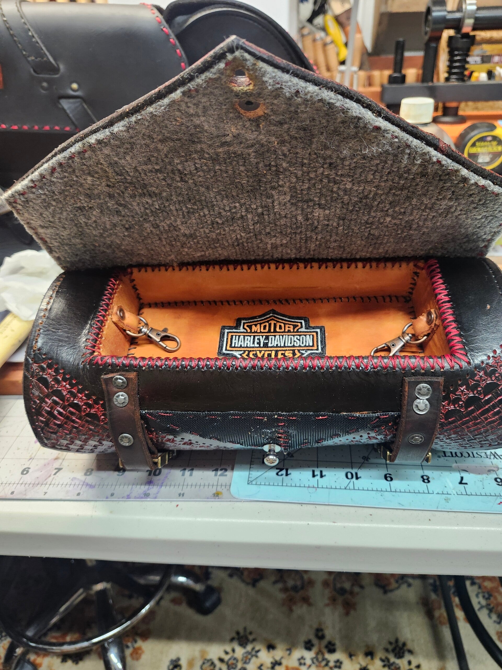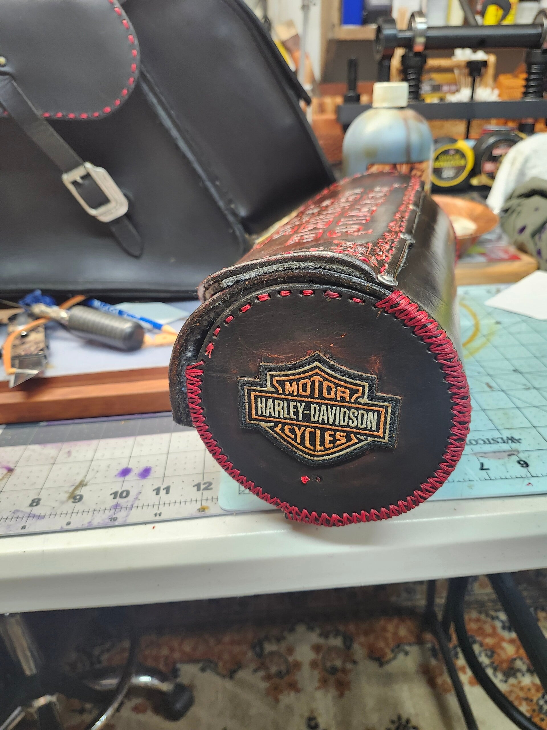 Handcrafted custom leather fork bags made to order from your personalized specifications and preferences can be made in a variety of different colors your logo, artwork can be hand-tooled into the leather cover and even on both ends of the bag can you be made in two standard sizes 4-in round by 12 or 5-in round by 12 Great addition to your motorcycle scooter bicycle wide range of applications great for holding gloves extra glasses keys wallet etc.